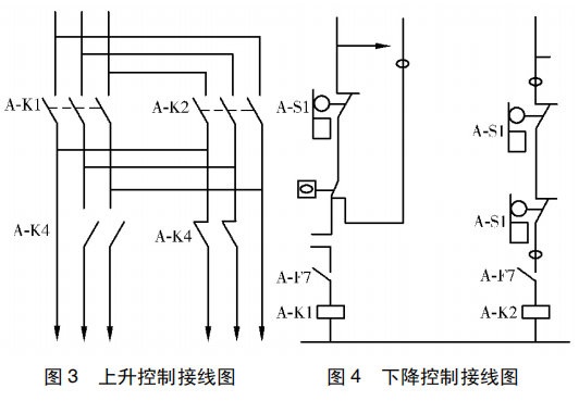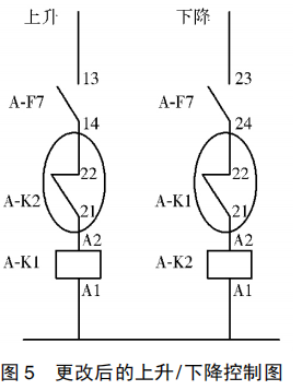 建議: 由于橋機電動葫蘆一般在檢修期使用較多,平時多為停機狀態,其廠房內震動較大,所以要注意日常維護,檢查元器件是否動作良好,有無銹蝕、接線松動等現象,并及時處理。更改其上升/下降控制圖,如圖 5。