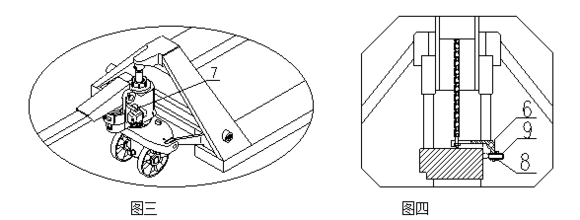 2、圖四中的螺釘9是用作調(diào)整車況的。當(dāng)車體上升后又馬上下降,可將螺釘53逆時(shí)針轉(zhuǎn)一點(diǎn)然后再試一下車子,直到正常上升。如果車體上升后無(wú)法下降,可將螺釘9順時(shí)針轉(zhuǎn)動(dòng)一點(diǎn)然后再試一下車子,直到能正常下降。螺釘9處的外六角螺母8是起鎖緊作用的,調(diào)整前應(yīng)松開(kāi),調(diào)整完畢后應(yīng)鎖緊。