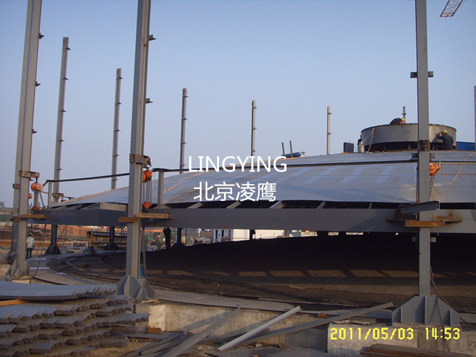 立拱頂胎架(如為拱頂罐),組焊儲罐頂板,在頂板上預留提升柱天窗。