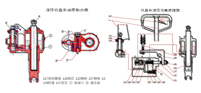 搬運車的起升過程:將捏手107置于A位置,此時卸荷撞針132沒有抵觸鋼球122,此時搖動手柄1,泵芯147在手柄1和彈簧149的共同作用下將作往復運動。當泵芯147向上提升時,柱塞泵a腔內形成負壓,閥芯120和閥體121在彈簧119的作用下處于罐壁裝填,而鋼球122由于油壓作用自動打開,油壓油從貯油室F腔流經e腔,再經鋼球122進入柱塞泵a腔內,柱塞泵吸油過程完成。