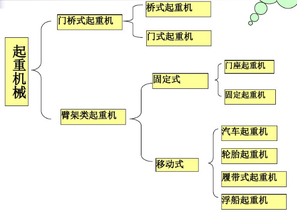 臂架型起重機分為:懸臂起重機、桅桿起重機、甲板起重機、塔式起重機、門座起重機、浮式起重機、流動式起重機等。