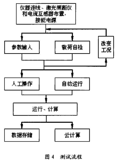 如下圖所示,測試開始前,將智能電表接入電動葫蘆控制箱的輸入端,互感器穿過電動葫蘆起升電機的相線,激光測距儀通過磁力座吸附于吊鉤滑輪組的側面罩殼上、者砝碼下面或側面。接通移動電源,接入工頻電流電源給移動電源充電。