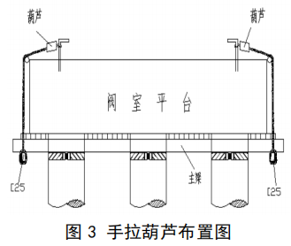 拆除底模支撐系統時,首先在閥室平臺上部的兩端各安置1個手拉葫蘆,手拉葫蘆的頂端掛在預埋的 Φ25mm 的鋼筋上,底部各吊 1 根 [25 的槽鋼,槽鋼垂直于主梁 I36a工字鋼,將兩根主梁支撐起;然后慢慢地逐個松動抱箍的高強螺栓,使抱箍下降一定的高度,為拆除工字鋼和木方留出空間,再將高強螺栓緊固至一定的程度,保證抱箍至少能承受工字鋼和木方的自重;最后將底模、木方、槽鋼和工字鋼依次取出。手拉葫蘆布置如圖 3 所示。