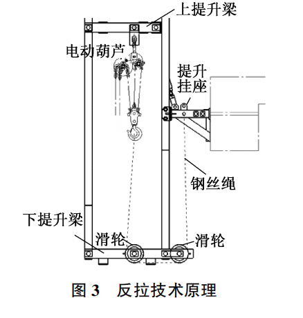 將電動葫蘆固定在架體上,隨架體升降,避免每次提升需倒換電動葫蘆。同時,針對傾覆力難以控制的問題,智能附著式升降腳手架采用滑輪換向,即采用鋼絲繩一端固定在電動葫蘆下掛鉤,另一端固定在附墻掛座上,中間通過滑輪換向,滑輪與提升梁上固定點呈豎直狀態?避免角度變化,保證了傾覆力矩為恒定值,且受力明確,架體升降時只需倒換鋼絲繩即可大大降低了倒換難度如圖3所示。電動葫蘆反拉技術的特點如下: