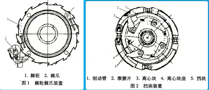 該類安全制動裝置也是裝于減速器低速級傳動末端卷筒的一端部,是一制動摩擦帶和附裝有離心塊擋塊裝置。制動摩擦帶纏于卷筒上,4塊棘輪通過高強螺釘壓緊制動摩擦帶,4個離心塊和擋塊均布固定在離心塊座上,位于卷筒內。正常情況下離心塊和制動摩擦帶隨卷筒一同轉動,當工作制動器失靈或傳動部件破斷,載荷快速下降使離心塊在離心力作用下打開,擋塊快速卡住離心塊使卷筒停住。因此,下落的重物被支持住實現制動。