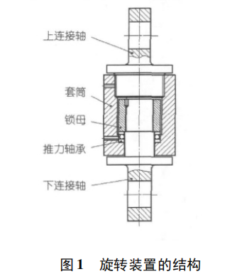鋼絲繩旋轉裝置的結構見圖1,上連接軸1與套筒2通過螺紋連接,并用銷釘鎖死形成一體,與此類似下連接軸5穿入套筒內后,與套筒內的鎖母3旋合并鎖死,這樣裝置就分為上下兩部分,這兩部分通過中間的推力軸承4連接起來。該裝置大的特點在于,由于有推力軸承存在,上下兩部分可以獨立地轉動,即在上連接軸發生旋轉時,下連接軸保持不動,這正滿足了解決鋼絲繩“打麻花”問題的要求。