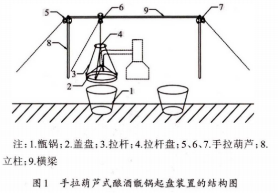 甑桶蒸餾技術不僅操作簡單,還能保證酒味純正,因為在白酒生產過程中被廣泛應用。為了減少起盤、封盤過程中的勞動量,設計了一種手拉葫蘆式釀酒甑鍋起盤裝置。要求該裝置在將蓋盤上拉過程中可減少所需拉力,待蓋盤上升至所需高度后可使蓋盤在兩口甑鍋之間來回移動,移動過程中不可使蓋盤搖擺幅度過大,最終達到省時、省力、方便的效果,消除在生產過程中存在刮傷、燙傷的安全隱患。