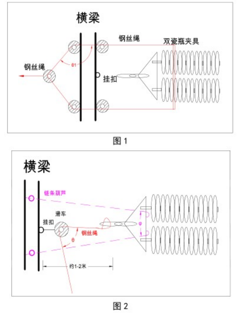 特殊敷設方法是將定滑車安裝在橫梁掛扣處,兩側安裝兩只鏈條葫蘆,當導線被牽引至離掛扣點約1-2米處,將鏈條葫蘆鉤子與導線鏈板底部相連接,然后同時慢慢收緊兩只鏈條葫蘆(如圖2所示)。當鏈條葫蘆受力后,卷揚機上的鋼絲繩不受力,解除掛扣上的滑車。當導線被牽引到位后,U形環固定就位,至此導線敷設工作完成。