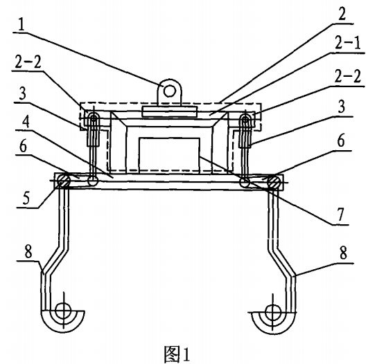 這種吊索具由吊環(1)、框架體(2)、兩個液壓油缸(3)、兩個橫梁(4)、兩個吊鉤軸(5)、兩個連動梁(6)、液壓泵(7)和四個吊鉤(8)組成,其特征在于:所述吊環(1)的下端面固接在框架體(2)的上端面上,所述兩個橫梁(4)水平設置在框架體(2)的下方,所述所述兩個橫梁(4)水平設置在框架體(2)下端面上,所述兩個液壓油軸缸(3)的缸體分別固接在框架體(2)的兩側,所述兩個液壓油缸(3)的連桿下端分別與連動梁(6)的一端連接,所述兩個吊鉤軸(5)與兩個橫梁(4)構成四框體,所述兩個橫梁(4)的兩端分別與吊鉤軸(5)轉動連接,所述兩個吊鉤軸(5)的中部分別與連動梁(6)的另一端連接,每個吊鉤軸(5)的兩端分別固接有吊鉤(8),所述液壓泵(7)位于框架體系(2)內并與框架體(2)固接,所述兩個液壓軸(3)通過油管分別與液壓泵(7)連通。