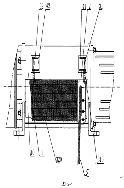 (1)包括位于卷筒外殼1的開口10處的導繩器2、導繩器2可沿著開口10左右移動,在導繩器2的移動區域相對應的卷筒外殼1兩端附近設置有下止點限位行程開關32、上止點限位行程開關31,下止點限位行程開關32、上止點限位行程開關31分別通過左開關固定板42、右開關固定板41安裝到卷筒外殼1上,下止點限位行程開關32、上止點限位行程開關31分別串聯到鋼絲繩電動葫蘆的控制回路中,下止點限位行程開關32、上止點限位行程開關31分別具有下止點撓性拔桿320、上止點撓性拔桿310。