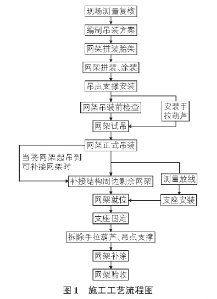 利用大起升高度手拉葫蘆作為吊裝起重設備。利用已完主體結構柱或梁作為手拉葫蘆的系掛構件。在網架吊點下部加設下吊撐,采用低位吊裝,可使網架的吊裝高度超過手拉葫蘆的系掛高度。將網架在主體結構范圍內進行拼接組裝,網架拼裝的大小要能使網架順利的通過主體結構,吊裝到超過就位標高后補拼網架側邊網絡構件,補拼后再進行網架就位固定。