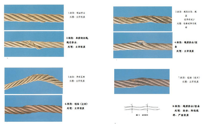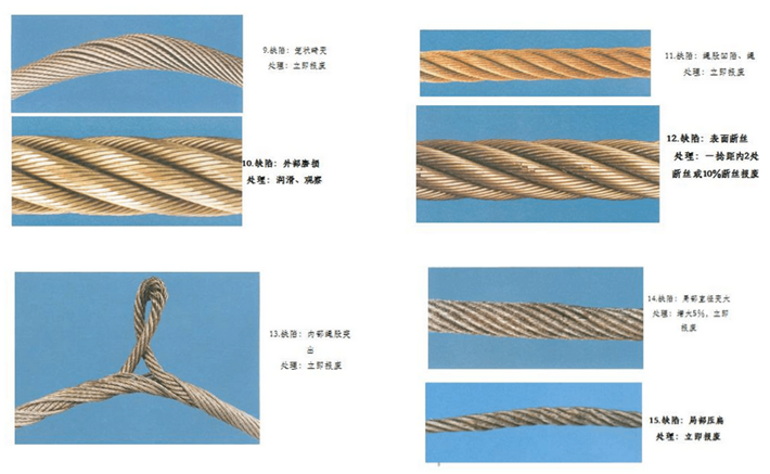 上面的圖片可以清楚的看出哪些鋼絲繩是需要報廢的,哪些是需要減少起重量來進行起吊的。鋼絲繩在上述所述立即報廢的情況下,需要立即報廢。否則會產生一些致命的危險。